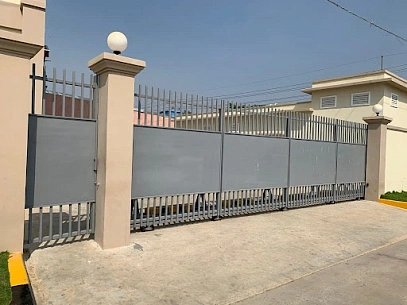 Откатные ворота — это конструкция, которая открывается путем сдвига полотна в сторону вдоль направляющей балки. Такие ворота устанавливаются параллельно фасаду здания и не занимают дополнительного пространства перед въездом. Они отлично подходят для загородных домов, гаражей, коммерческих помещений и складских комплексов.